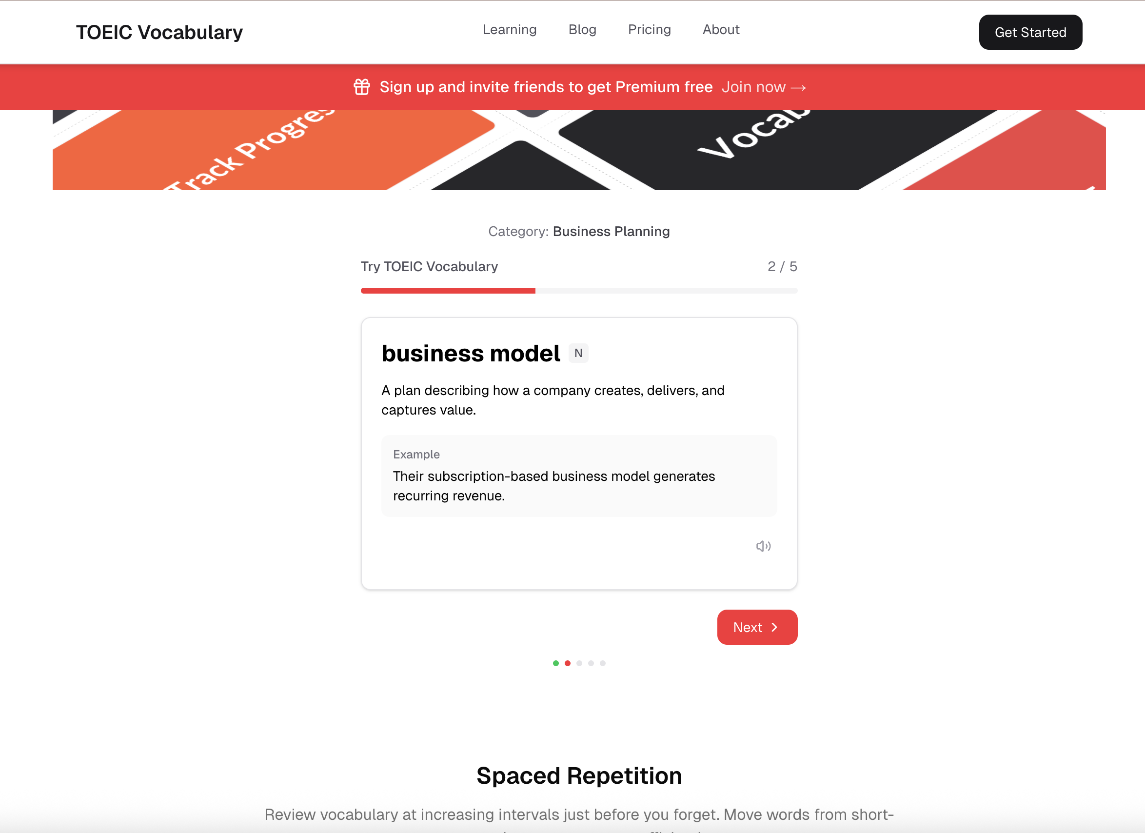 Master TOEIC vocabulary with spaced repetition and interactive exercises. Learn words in context with examples and audio.